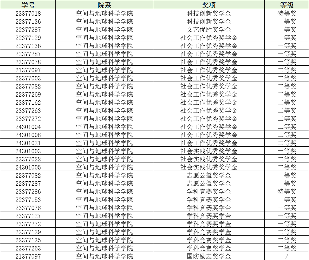 根据《关于做好2025年“北航之友”奖学金、社会助学金评审工作的通知》、《2024-2025学年科技创新奖学金等5项校级优秀奖学金评选工作提示》、《关于开展2024-2025学年北航学科竞赛奖学金评选工作的通知》、《关于开展2024-2025学年国防励志奖学金评选工作的通知》、《关于开展2024-2025学年少数民族生励志奋进奖学金评选工作的通知》,空间与地球科学学院现将2025年“北航之友”奖学金、社会助学金推荐结果及校级优秀奖学金结果进行公示。