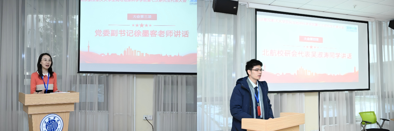 院党委副书记徐墨客代表学院党委祝贺大会召开。她指出,本次大会恰逢 “十四五” 收官、“十五五” 谋划的关键节点,契合国家三大战略,研究生会要利用好这个重要契机,推动学院团学工作高质量发展。她强调,研究生是国家科技创新主力军、新质生产力重要源头活水,打造良好生长环境是研会的核心价值。针对新一届研会及广大研究生,她提出三点希望:一是传承 “空天报国” 精神,将个人理想融入国家事业;二是聚焦前沿, 以科研服务高质量发展;三是坚守服务宗旨,搭建师生桥梁,解决同学实际困难。