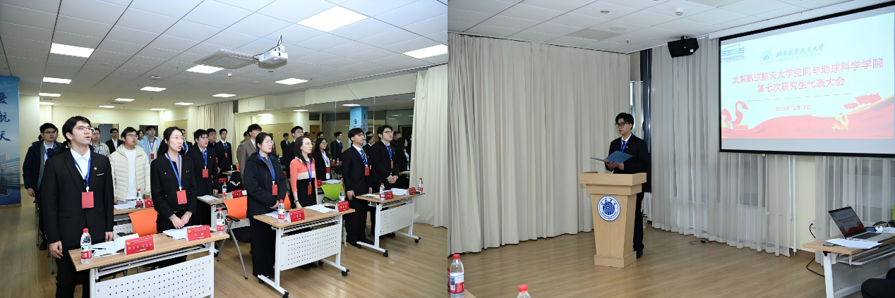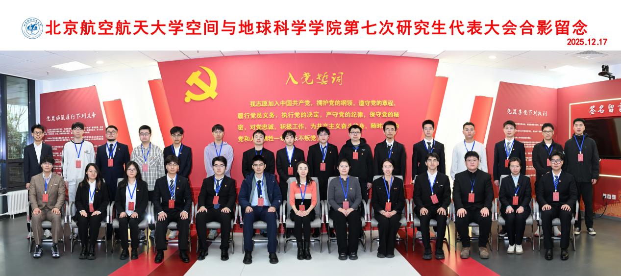 在深入学习贯彻党的二十届四中全会精神,奋力冲刺“十四五”规划圆满收官,精心擘画“十五五”发展关键蓝图的关键节点,2025年12月17日13时,空间与地球科学学院第七次研究生代表大会在沙河文化艺术共享空间8-B106召开。北航校研会主席吴淑涛、学院党委副书记徐墨客、团委书记门雪洁、专职辅导员冯骥、2025级研究生辅导员阿力木·艾力木以及我院各研究生代表团代表22人参会。会议由2024级研究生苏一溪主持。大会在庄严的国歌中隆重开幕。