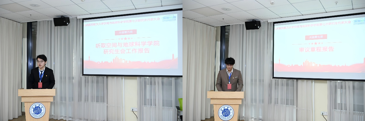 随后,空间与地球科学学院研究生会主席团成员王超奇宣读了《北京航空航天大学空间与地球科学学院研究生代表大会代表资格审查报告》,大会审议通过了代表资格审查报告,确认代表资格全部有效。王超奇代表研究生会做了《北京航空航天大学空间与地球科学学院研究生会工作报告》。报告从“铸魂领航强信念,激扬青春向征程”、“智汇科创攀高峰,深耕学术育新苗”、“文体浸润育情操,师生同心谱华章”、“强化制度创新,勇毅前行奏响时代强音”四个部分,回顾了研会过去一年的工作,并对未来的工作进行了展望。