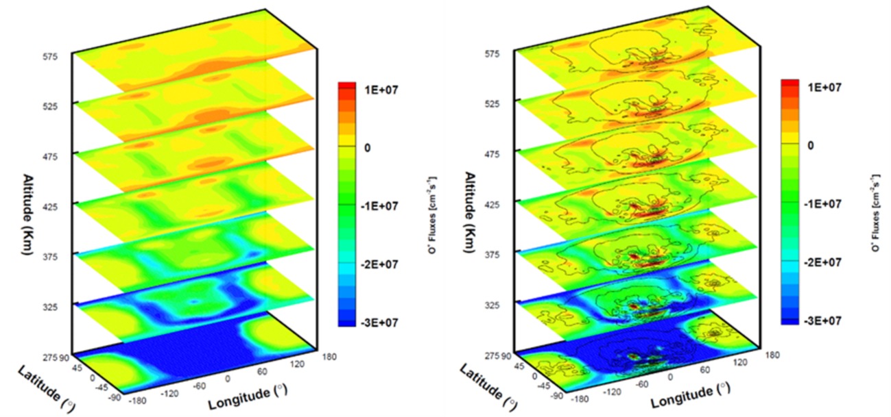 针对类地行星空间环境中多离子组分耦合动力学过程难以自洽模拟的问题,团队建立了我国首个具有独立知识产权的火星全球三维10组分多流体多圈层耦合模型。该模型耦合火星热冕大气模型与多流体Hall-MHD模型,将电离层离子组分数量由4种提高到10种、化学反应由10种扩展至68种,显著提升了火星离子空间分布结构和离子逃逸率的模拟精度。